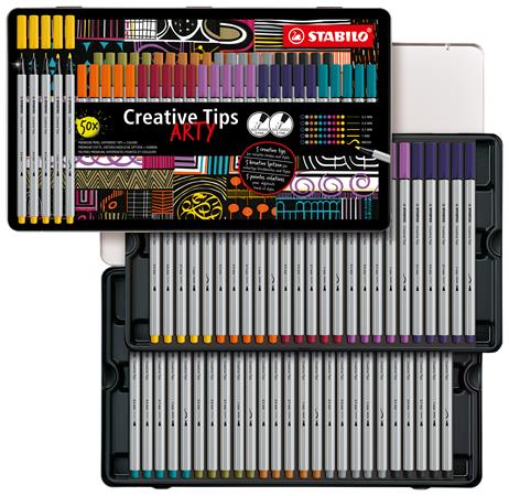 Tűfilc készlet, fém doboz, STABILO "Creative Tips ARTY", 10 különböző szín, 5 különböző vastagság