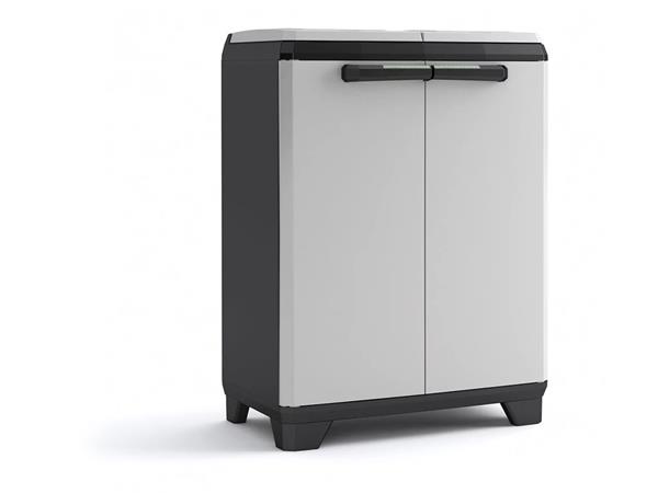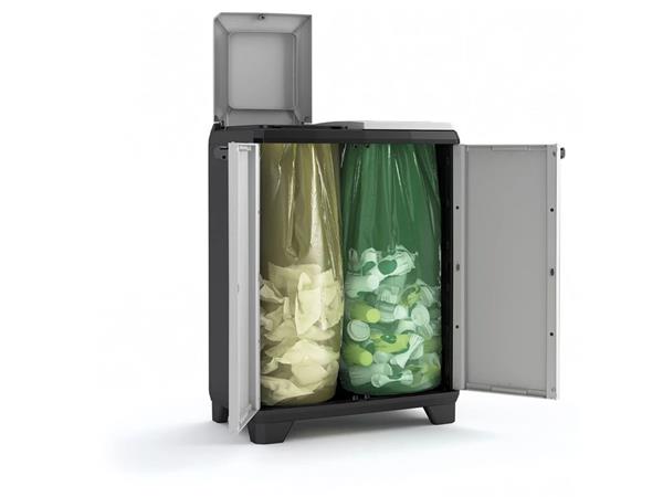 A KETER Split Premium szelektív hulladékgyűjtő szekrény intelligens kialakításának és modern, sötétszürke/fekete megjelenésének köszönhetően stílusosan és egyszerűen tesz a környezet védelméért.